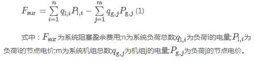 當(dāng)系統(tǒng)阻塞時,產(chǎn)生阻塞價格分量,導(dǎo)致受阻節(jié)點的出清價格抬升,由此可利用價格杠桿調(diào)節(jié)負(fù)荷大小及影響負(fù)荷分布,避免按統(tǒng)一出清價結(jié)算時,由于阻塞而導(dǎo)致負(fù)荷之間的交叉補(bǔ)貼。阻塞導(dǎo)致輸電線路兩側(cè)的發(fā)用電節(jié)點電價出現(xiàn)差異,帶來購售費用的偏差。在忽略網(wǎng)損的情況下,負(fù)荷側(cè)購電費用與發(fā)電側(cè)支付費用的差額即為阻塞盈余[18],其計算公式如下: