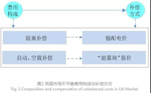 英國電力市場中的啟停、空載等成本在報價中一并考慮,不再另外補(bǔ)償。英國電力交易所在進(jìn)行交易出清時,提供了靈活多樣的報價形式供市場成員自由選擇,不同的報價形式能夠滿足各類市場成員差異化的發(fā)用電特性。以APX中的拍賣市場為例,市場成員最簡單的報價形式是每個小時分別報價,各時段之間獨立成交。但對發(fā)電企業(yè)而言,這樣報價的成交結(jié)果可能無法滿足機(jī)組自身的啟停約束或爬坡約束。此時,發(fā)電企業(yè)可以將任意幾個連續(xù)的時段組成一個“能量塊”進(jìn)行報價,比如將早上8:00至中午12:00組成一個包含4h的能量塊;像核電這樣的基荷機(jī)組,則可以將全天24h組成一個能量塊,一個能量塊中所包含的時段要么同時成交,要么同時不成交,從而滿足機(jī)組連續(xù)運(yùn)行的需要。此外,為了保證機(jī)組的啟停、空載等成本回收,通常采用關(guān)聯(lián)報價的方式,市場成員可以指定只有當(dāng)某個能量塊的報價成交時,另一個能量塊的報價才能成交。例如,一個處于停機(jī)狀態(tài)的機(jī)組準(zhǔn)備啟機(jī)運(yùn)行,那么可以在需要啟機(jī)運(yùn)行的時段申報一個價格較高的能量塊以便能夠回收啟機(jī)成本,然后在啟機(jī)之后的時段申報一個僅考慮燃料成本的較低價格的能量塊,并將兩個能量塊設(shè)置為關(guān)聯(lián)報價,這樣就能夠保證只有當(dāng)啟機(jī)時段的能量塊中標(biāo)后,后續(xù)時段的能量塊才能中標(biāo)。由于在報價中考慮了開停機(jī)成本,因此無需再作單獨的成本補(bǔ)償。英國電力市場不平衡費用的構(gòu)成及其補(bǔ)償方式見圖2。