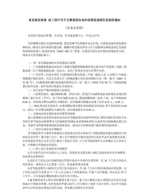 近日,江蘇省發(fā)展改革委、工信廳聯(lián)合發(fā)布《關(guān)于完善差別化電價(jià)政策促進(jìn)綠色發(fā)展的通知(征求意見稿)》(以下簡稱《意見稿》),對能源消耗超過國家及江蘇地方能耗限額標(biāo)準(zhǔn)所規(guī)定的單位產(chǎn)品能耗(電耗)限額標(biāo)準(zhǔn)的企業(yè),實(shí)行生產(chǎn)經(jīng)營用電懲罰性電價(jià)。
