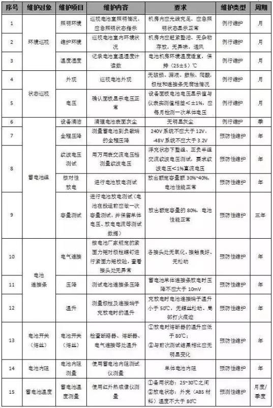 如下表所示,為蓄電池組維護(hù)周期表