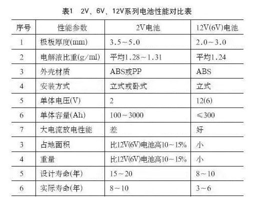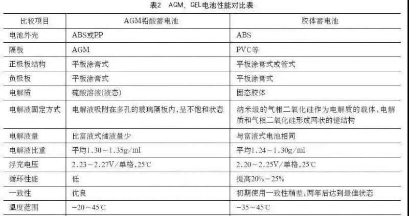 作為后備用途的VRLA電池按單體電壓等級(jí)分為2V、6V、12V等系列。按固定電解液的方式可分為AGM(超細(xì)玻璃纖維)電池和GEL(膠體)池,其對(duì)比別見(jiàn)表1和表2