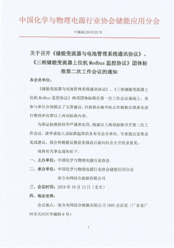 關(guān)于召開《儲能變流器與電池管理系統(tǒng)通訊協(xié)議》、《三相儲能變流器上位機(jī)Modbus監(jiān)控協(xié)議》團(tuán)體標(biāo)準(zhǔn)第二次工作會議的通知
