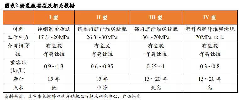 因此車載儲(chǔ)氫瓶主要是用后兩種類型的儲(chǔ)氫瓶。III型、IV型瓶由內(nèi)膽、碳纖維強(qiáng)化樹脂層及玻璃纖維強(qiáng)化樹脂層組成,氣瓶質(zhì)量較輕,單位質(zhì)量?jī)?chǔ)氫密度有所提高。