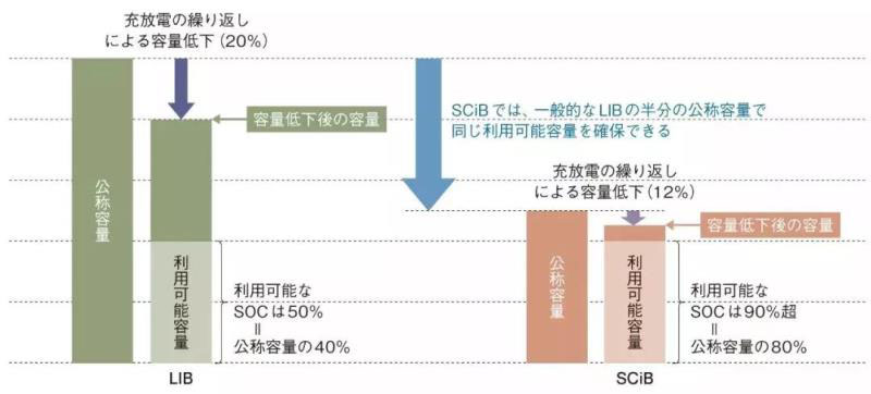 東芝公司的想法是采用鈦酸鋰(LTO)氧化物作為負(fù)極的鋰電池“SCiB”。由于SCiB的能量密度低于普通LIB,因此必須堆疊“1.5倍”才能達(dá)到相同的容量。