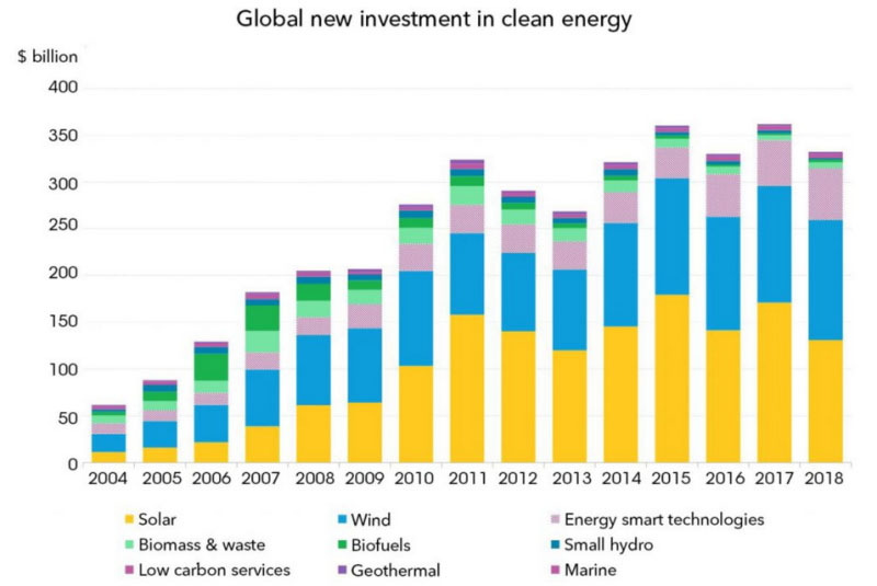 彭博社新能源財(cái)經(jīng)公司對(duì)2004年至2018年全球清潔能源行業(yè)總投資的評(píng)估提供另一個(gè)視角。