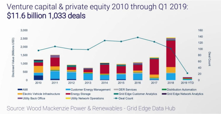 2018年全球儲(chǔ)能市場投資比往年顯著增加,但2019年第一季度的投資有所減緩。然而,2010-2019年期間獲得116億美元投資并不令人意外。還需要注意的是,儲(chǔ)能系統(tǒng)在投資中發(fā)揮了越來越重要的作用。