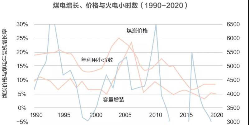 從歷史上來看,1990年以后,我國煤電裝機(jī)的增裝速度保持在每年5%-10%之間,除了2003年電荒的那幾年,節(jié)奏十分穩(wěn)定。如果審視其波動(dòng),年利用小時(shí)與煤炭價(jià)格的關(guān)系似乎更加密切,而不是政策因素。這一假說無疑需要更仔細(xì)的計(jì)量方面的檢驗(yàn),這將是今后一段時(shí)期的工作。