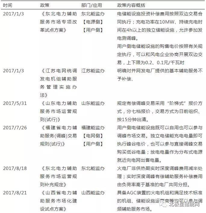 2017年11月,國家能源局發(fā)布《完善電力輔助服務(wù)補(bǔ)償(市場(chǎng))機(jī)制工作方案》,明確了全面推進(jìn)電力輔助服務(wù)補(bǔ)償(市場(chǎng))工作主要目標(biāo)和主要任務(wù),自2017年至2020年,分三階段進(jìn)行實(shí)施。其中,第二階段的任務(wù)是建立電力用戶參與電力輔助服務(wù)分擔(dān)共享機(jī)制,其亮點(diǎn)在于《方案》鼓勵(lì)“電力用戶參與提供電力輔助服務(wù),簽訂帶負(fù)荷曲線的電力直接交易合同”,這也就創(chuàng)造了對(duì)輔助服務(wù)的市場(chǎng)需求,從而為用戶需求響應(yīng)和儲(chǔ)能參與電力市場(chǎng)創(chuàng)造了條件。