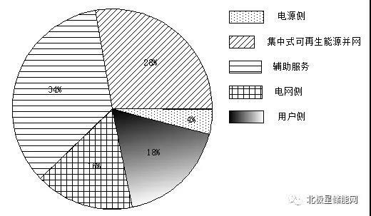 目前,儲(chǔ)能在我國電力市場(chǎng)有5個(gè)應(yīng)用領(lǐng)域:電源側(cè)、集中式可再生能源并網(wǎng)、輔助服務(wù)、電網(wǎng)側(cè)、用戶側(cè)[14, 15]。根據(jù)CNESA的數(shù)據(jù),截止2017年底全球電化學(xué)儲(chǔ)能項(xiàng)目在電源側(cè)、集中式可再生能源并網(wǎng)、輔助服務(wù)、電網(wǎng)側(cè)、用戶側(cè)的占比分別為4%、28%、34%、16%和18%(見圖3),其中可再生能源并網(wǎng)的累計(jì)裝機(jī)規(guī)模達(dá)到820.8MW,占全球累計(jì)投運(yùn)電化學(xué)儲(chǔ)能規(guī)模的28%,與2016年相比增幅達(dá)36.6%。目前,集中可再生能源并網(wǎng)項(xiàng)目已經(jīng)初具規(guī)模,輔助服務(wù)和電網(wǎng)側(cè)項(xiàng)目也迎來新的發(fā)展。