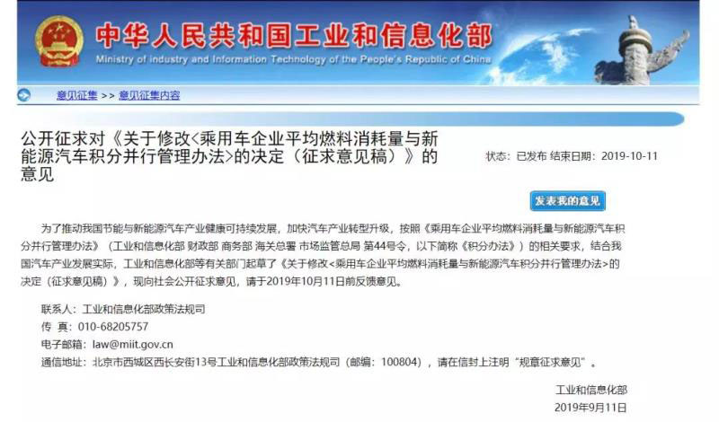 9月11日,工信部等有關(guān)部門公布了《關(guān)于修改<乘用車企業(yè)平均燃料消耗量與新能源汽車積分并行管理辦法>的決定(征求意見(jiàn)稿)》(以下簡(jiǎn)稱新版雙積分政策修正案),這一次依舊向社會(huì)公開征求意見(jiàn),并提出請(qǐng)于2019年10月11日前反饋意見(jiàn)。