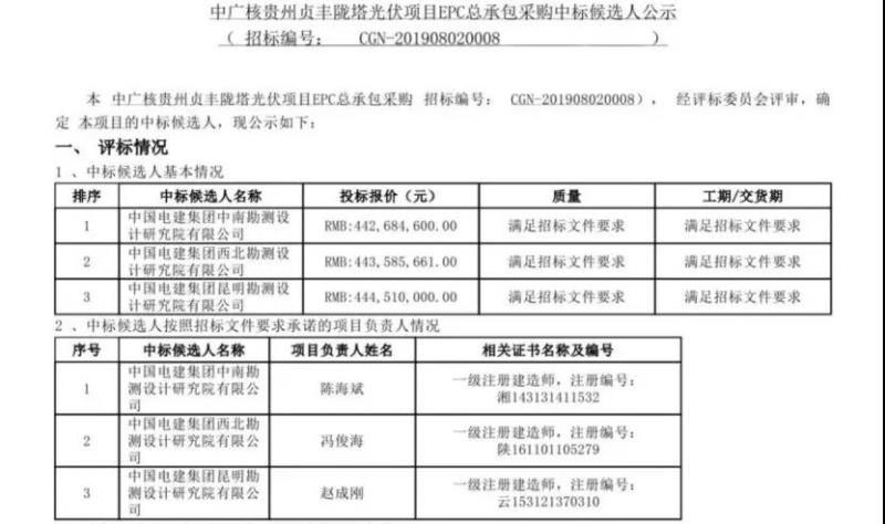 9月11日,中廣核貴州貞豐隴塔100MW光伏項目公示EPC總承包采購中標候選人。中國電建集團中南勘測設(shè)計研究院有限公司以單價4.427元瓦位列第一中標候選人,詳情如下: