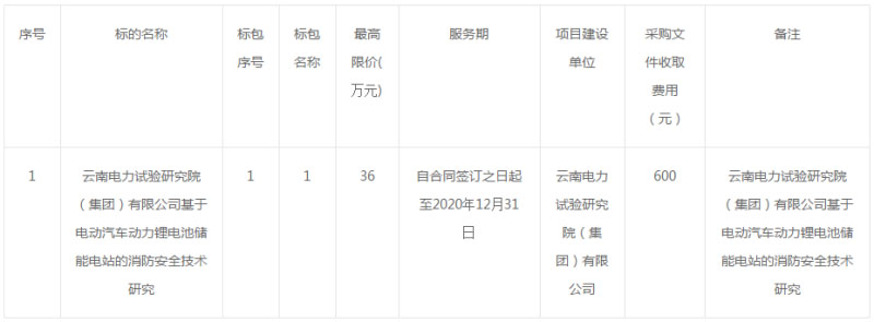 云南電力試驗(yàn)研究院(集團(tuán))有限公司基于電動汽車動力鋰電池儲能電站的消防安全技術(shù)研究采購公告