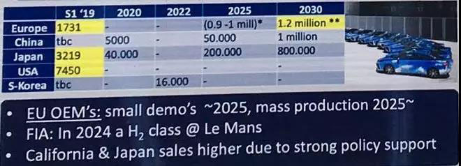 從銷量來看,美國最多,截止今年第一季度達到7450輛,日本次之,也有3219輛,歐洲氫燃料電池汽車銷量是1731輛(中國和韓國數據待確認)。如果按照李駿的數據,中國與日本的銷量規(guī)模差不多。