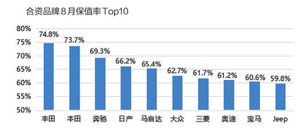8月,合資品牌保值率整體穩(wěn)定。日系的豐田、本田長期交替在榜單第一、二位,這是品牌力和產品力堅挺使然;德系的奧迪品牌保值率明顯提高,由60.7%上升到61.2%;日產和大眾品牌的排名較上月均上升一位。