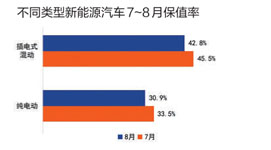 從7月和8月新能源汽車保值率來看,無論是插電式混動還是純電動車,保值率均在下降。隨著電池等技術的發(fā)展,新能源汽車的屬性已從工業(yè)品轉型為電子類商品,技術更新迭代周期短,供給側制造成本逐漸降低。這兩年,新車續(xù)駛里程顯著提升,換代加速。目前推出的新車純電續(xù)駛里程普遍超過400公里,這加速了舊車貶值。產品換代帶來的“嘗鮮”心理,也導致新能源汽車的置換周期與消費者預期有很大差異。整體來看,未來新能源汽車貶值將越發(fā)嚴重。