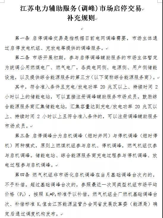 據(jù)悉,《啟停規(guī)則》作為《江蘇電力輔助服務(wù)(調(diào)峰)市場交易規(guī)則》的補充條款,共二十條,涵蓋啟機調(diào)峰、停機調(diào)峰、充放電調(diào)峰等交易規(guī)則,明確儲能參與輔助服務(wù)市場的具體措施?!秵⑼R?guī)則》印發(fā)將為統(tǒng)調(diào)公用燃煤電廠、燃氣電廠,各類儲能設(shè)施,以及提供綜合能源服務(wù)的第三方等市場主體規(guī)范參與啟停調(diào)峰輔助服務(wù)市場提供交易依據(jù),并擴大了輔助服務(wù)市場規(guī)模、豐富了交易品種。