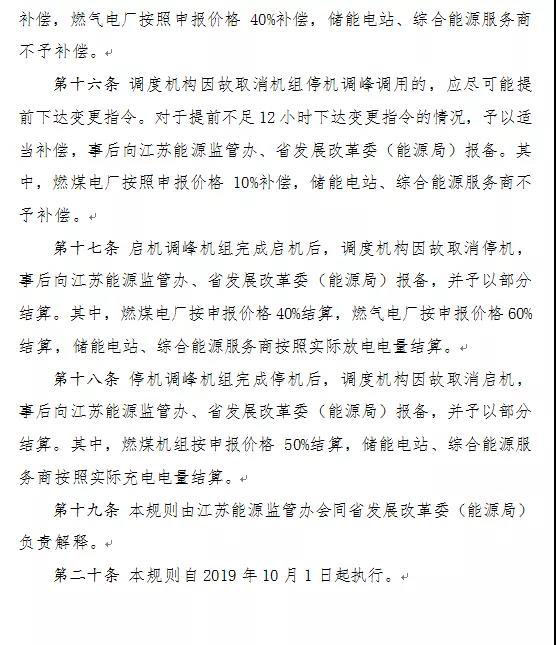 為進一步完善江蘇電力輔助服務(wù)補償機制,促進調(diào)峰資源優(yōu)化配置,決定自2019年10月1日起:深度調(diào)峰市場40%以下負荷段最高限價調(diào)高至1000元/兆瓦時;參與輔助服務(wù)補償費用分攤但不提供調(diào)峰和調(diào)頻輔助服務(wù)的發(fā)電企業(yè),調(diào)整為按平均運行容量2倍分攤輔助服務(wù)補償費用。