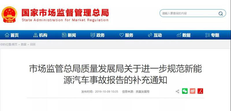 根據(jù)《市場(chǎng)監(jiān)管總局辦公廳關(guān)于進(jìn)一步加強(qiáng)新能源汽車產(chǎn)品召回管理的通知》(市監(jiān)質(zhì)函〔2019〕531號(hào)),為強(qiáng)化新能源汽車產(chǎn)品安全召回監(jiān)管,進(jìn)一步規(guī)范新能源汽車事故報(bào)告制度,現(xiàn)補(bǔ)充通知如下: