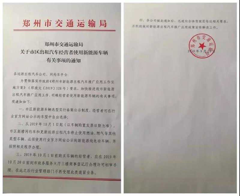 中國(guó)儲(chǔ)能網(wǎng)訊:記者從鄭州市交通運(yùn)輸局直屬單位——鄭州市城市公共交通客運(yùn)管理處網(wǎng)站獲悉,9月29日,鄭州市交通運(yùn)輸局發(fā)布了《關(guān)于市區(qū)出租汽車經(jīng)營(yíng)者使用新能源車輛有關(guān)事項(xiàng)的通知》(以下簡(jiǎn)稱《通知》)。要求自2019年10月1日起,鄭州市的市區(qū)新增網(wǎng)約車和更新巡游出租車停止使用燃油、燃?xì)獾绕渌愋蛙囕v,必須使用官方網(wǎng)站公示的新能源純電動(dòng)車輛。