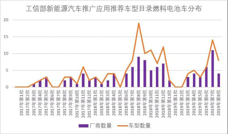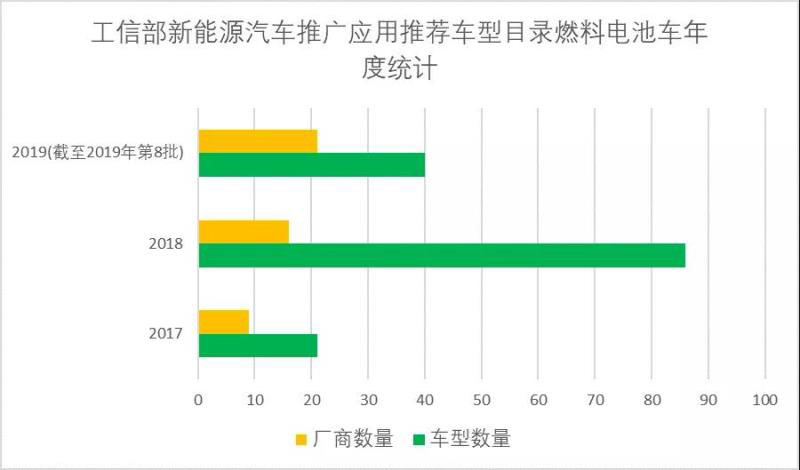 據(jù)國(guó)發(fā)能研院、綠能智庫(kù)統(tǒng)計(jì)數(shù)據(jù)顯示,工信部發(fā)布的新能源汽車推廣應(yīng)用推薦車型目錄中,商用的燃料電池車型從2018年起快速增多,涉及汽車廠商數(shù)量急劇增長(zhǎng)。相比2017年,2018年目錄中燃料電池車型數(shù)量和汽車廠商數(shù)量分別增長(zhǎng)309.5%和77.8%,2019年1-8月推出燃料電池汽車的廠商數(shù)量比2018年全年增長(zhǎng)31.3%。2019年第7批目錄中,11家廠商就推出了19款燃料電池汽車。