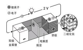 惠廷厄姆的鋰電池優(yōu)點(diǎn)是鋰離子儲(chǔ)存在陰極中的二硫化鈦中。使用時(shí),鋰離子從陽(yáng)極中的鋰流向陰極中的二硫化鈦,給電池充電時(shí),則鋰離子反向回流。