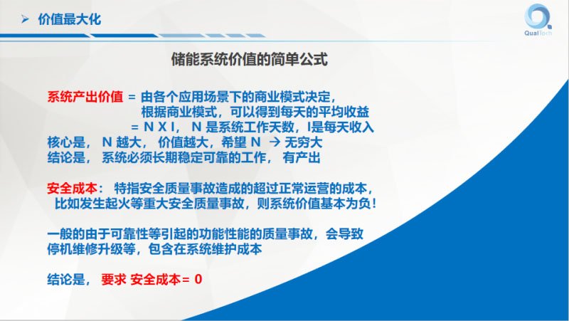 今天重點講的是價值,儲能系統(tǒng)的價值=系統(tǒng)持續(xù)產(chǎn)出部分-初始投資-系統(tǒng)運營成本-安全成本。系統(tǒng)產(chǎn)出價值可以隨著時間不斷積累增加。安全成本開始可能不發(fā)生,隨著時間的推移不斷的累積,直到某一天直接爆發(fā)。運營成本的大小可以通過我們的努力不斷降低。