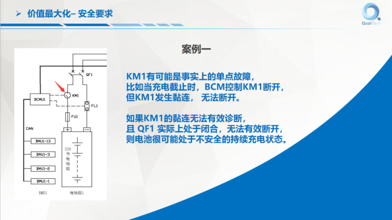 講幾個簡單案例,儲能系統(tǒng)里的一個簇,比如說上面寫著電池,我們看一下KM1繼電器,它可能存在單點故障,BMS充電需要截止,要把繼電器斷開,繼電器不是百分之百斷開,可能粘連了就無法斷開。無法斷開怎么辦?得想辦法知道粘連了,才會有對策。有些情況下可能檢測不出來,這就沒辦法。QF一般是斷路器,斷路器一般不太經(jīng)常的開關(guān),斷路器一般都是處于閉合狀態(tài),當(dāng)QF1一旦粘連,如果沒有辦法診斷,就可能繼續(xù)充電。整個系統(tǒng)可能有很多,其他的還在充電,這個簇可能還在繼續(xù)充電,過了一段時間可能出現(xiàn)過壓的問題,時間長了電池就有問題了。