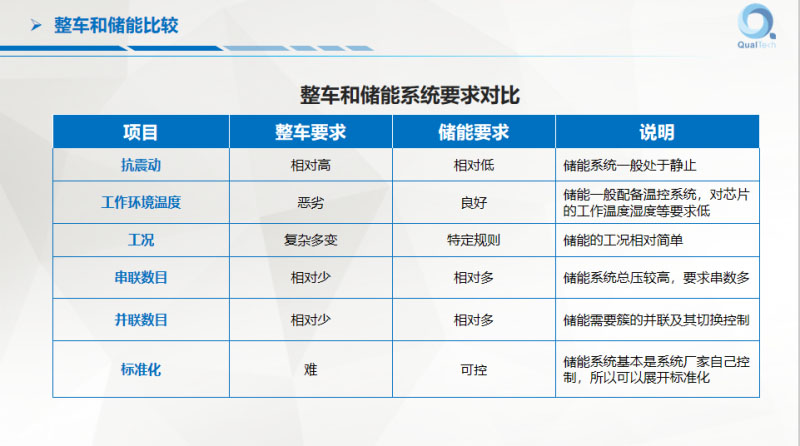 整車的BMS和儲能的BMS到底有什么區(qū)別?本來想在這里多講一下,沒有多少時間我過一下。整車和儲能相比,我的結(jié)論是儲能的要求跟汽車差不多,后果比汽車更嚴(yán)重,一定要以汽車級的電池管理進(jìn)行開發(fā),16949和ISO的指導(dǎo)下進(jìn)行儲能系統(tǒng)的設(shè)計,才可以在方法和體系上保障它的安全、可靠的級別。不是一般的、隨便搞兩下。