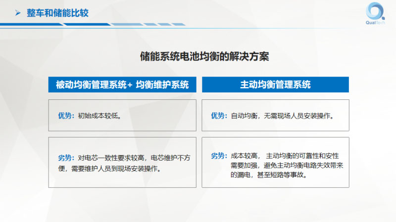 運營效率今天沒時間了,包括BMS廠家、包括PCS廠家,大家怎么把這個系統(tǒng)做得效率高?這是BMS的核心功能(見PPT)、這是我們做的主動均衡方案介紹(見PPT),剛才講到失效的分析,我們提供的主動均衡解決方案解決了失效安全的問題,我們可以避免剛才說的這些問題,確保在電池端不會發(fā)生短路。