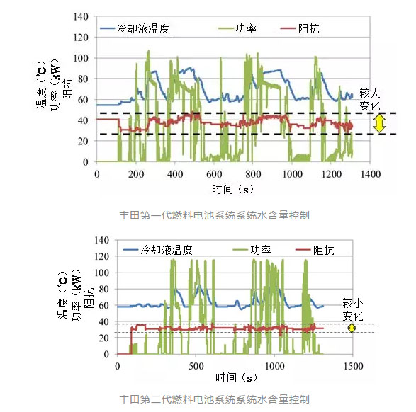 在此將豐田文獻(xiàn)中給出的一些車用測試結(jié)果分享給大家,作為結(jié)束。上述兩幅圖為豐田在第一代和第二代燃料電池系統(tǒng)中水含量控制效果。