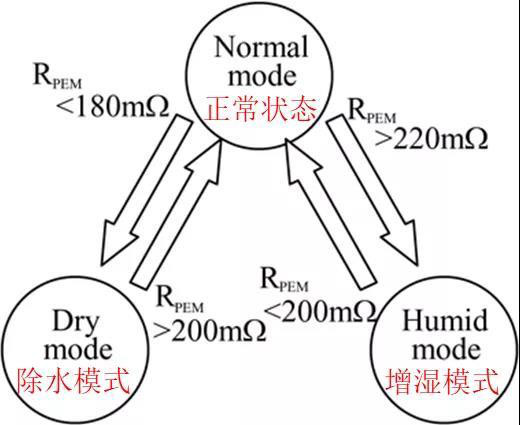 用A、B、C、D四個點(diǎn)將圖1中曲線分成三段,AB段代表燃料電池單片水含量過低,CD段代表燃料電池單片水含量過高,無論燃料電池單片水含量過高或過低都將導(dǎo)致燃料電池輸出性能下降(上圖所示),中間BC段代表燃料電池水含量和輸出性能變化是有邊界的。豐田實(shí)驗(yàn)數(shù)據(jù)表明,BC段是一定存在的,其存在的意義是燃料電池系統(tǒng)水管理策略的實(shí)時(shí)性要求有所降低,同時(shí)B點(diǎn)和C點(diǎn)的選擇是有依據(jù)的,至少有四個方面:第一,B點(diǎn)和C點(diǎn)的燃料電池輸出電壓是相近的;第二,B點(diǎn)與C點(diǎn)之間的燃料電池阻抗變化必須是可測量的且可有效區(qū)分的;第三,B點(diǎn)和C點(diǎn)之間的燃料電池工作條件控制是易于實(shí)現(xiàn)的;第四,B點(diǎn)和C點(diǎn)之間的燃料電池水含量變化對耐久性的損傷是較弱的,比如質(zhì)子交換膜膨脹率、膜電極電流和溫度分布均勻性。