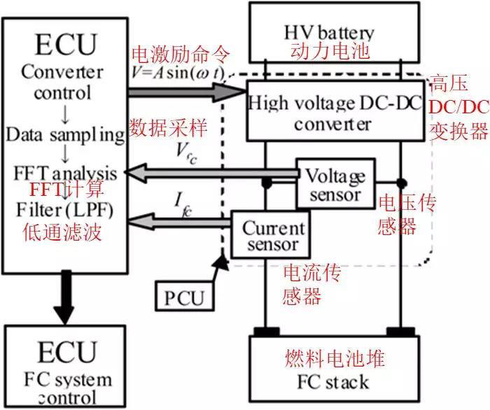 下圖為豐田燃料電池系統(tǒng)交流阻抗測量技術(shù)原理。從電氣配置角度講,具備高壓DC/DC變換器、電流傳感器、電壓傳感器。其中,高壓DC/DC變換器與燃料電池堆正負(fù)極相連,用于對燃料電池堆施加電激勵信號;電流傳感器用于測量燃料電池堆的輸出電流;電壓傳感器用于測量燃料電池堆的輸出電壓。盡管豐田MIRAI燃料電池動力系統(tǒng)構(gòu)型與下圖有差異,但對燃料電池堆施加電激勵信號均為DC/DC變換器,只是DC/DC變換器主要服務(wù)對象從動力電池?fù)Q成了燃料電池,在此不作區(qū)分。