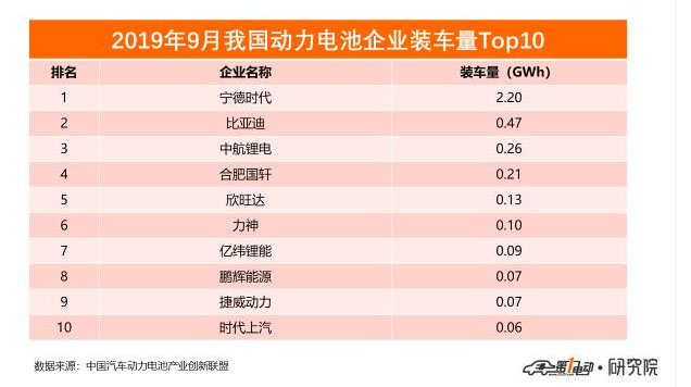 2019年1-9月,我國新能源汽車市場共計73家動力電池企業(yè)實現(xiàn)裝車配套,排名前10家動力電池企業(yè)動力電池裝車量為37.1GWh,占總裝車量比88%。