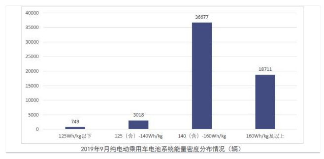 純電動乘用車電池系統(tǒng)能量密度分布來看,2019年9月,我國純電動乘用車系統(tǒng)能量密度在160Wh/kg及以上區(qū)間產(chǎn)量共計1.9萬輛,占純電動乘用車總產(chǎn)量由26.3%上升至31.6%;在125(含)-140Wh/kg和140(含)-160Wh/kg以上區(qū)間的車型產(chǎn)量分別為0.3萬輛和3.7萬輛,分別占純電動乘用車總產(chǎn)量5.1%和62%。