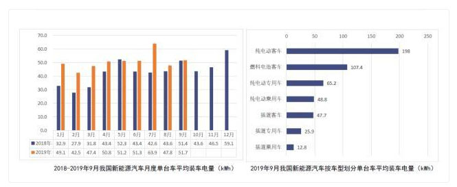 從單臺車平均裝車電量情況來看,2019年9月,受新能源客車產(chǎn)量小幅上升帶動,我國新能源汽車按車型劃分的平均裝車電量51.7.8kWh,環(huán)比上升8.2%。