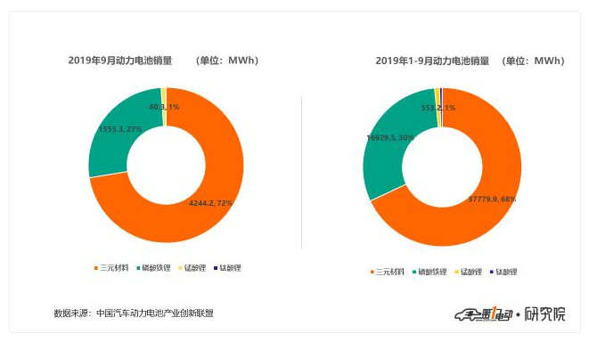 2019年1-9月,我國動力電池累計銷量達(dá)55.6GWh,其中三元電池累計銷售37.8GWh,占總銷量68%;磷酸鐵鋰電池累計銷售16.9GWh,占總銷量比30.5%。磷酸鐵鋰電池市場較去年同期仍存在一定差距。