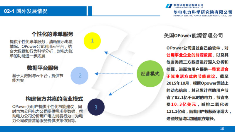 美國綜合能源方面,他們不僅僅是現(xiàn)在的分布式能源,美國現(xiàn)在電力市場比較靈活,當(dāng)然他們還有一些節(jié)能服務(wù)的綜合能源公司,像美國的OPower是典型的節(jié)能公司,他們建立了信息化的能耗平臺(tái),給用戶進(jìn)行節(jié)能的建議和效益的提升。
