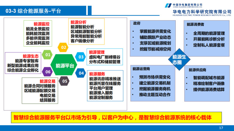 在能源的服務(wù)平臺(tái)方面,服務(wù)是綜合平臺(tái)系統(tǒng)的核心,也是按照市場為導(dǎo)向、客戶為中心建設(shè),借鑒能源互聯(lián)網(wǎng)平臺(tái)的理念,形成開放式的協(xié)作和服務(wù)體系,這是綜合能源服務(wù)很有價(jià)值的地方。服務(wù)平臺(tái)可以對(duì)能源的監(jiān)控、分析、管理、服務(wù)、交易等,通過對(duì)政府能源服務(wù)商、供應(yīng)商和能源的運(yùn)營商構(gòu)建生態(tài)的能源系統(tǒng),在平臺(tái)里面可以進(jìn)行很好的耦合和資源的共享。