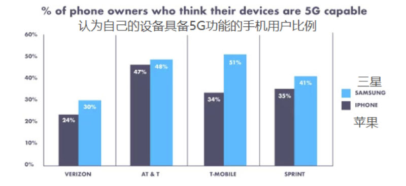 而在美國,只有64%受訪者聽說過5G,而且不認為5G比快充、無線充電甚至防水功能更重要。在另一份來自美國二手電子設(shè)備平臺Decluttr的用戶調(diào)研中,給出了更令人瞠目結(jié)舌的結(jié)果:高達24-51%用戶認為自己手上的三星或蘋果手機已經(jīng)支持了5G網(wǎng)絡(luò)——當然這是不可能的。