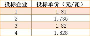 據(jù)光伏們了解,315W標(biāo)段經(jīng)過商務(wù)標(biāo)和技術(shù)標(biāo)的評(píng)審之后,一共四家企業(yè)通過并參與價(jià)格標(biāo)的開標(biāo),開標(biāo)情況如下表: