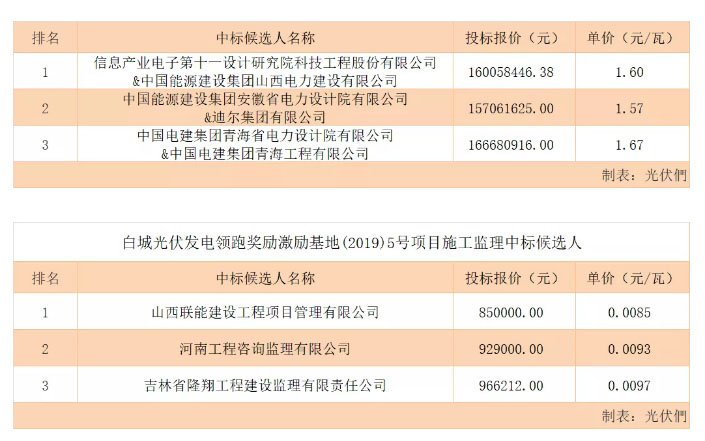 信息產(chǎn)業(yè)電子第十一設計研究院科技工程股份有限公司&中國能源建設集團山西電力建設有限公司的聯(lián)合體,以16005.844638萬元的總報價、單價1.6元/瓦位列EPC工程總承包第一中標候選人;山西聯(lián)能建設工程項目管理有限公司以85萬元的總報價,單價0.0085元/瓦位列施工監(jiān)理第一中標候選人。中標候選人詳情如下: