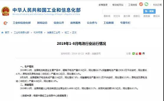 中國儲(chǔ)能網(wǎng)訊:2019年10月22日,工信部消費(fèi)品司發(fā)布2019年1-8月電池行業(yè)運(yùn)行情況。以下為詳細(xì)情況: