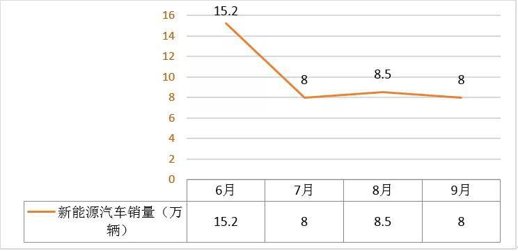 但近期新能源車銷售卻持續(xù)遇冷,2019年10月14日,中國汽車工業(yè)協(xié)會數(shù)據(jù)顯示,9月份,我國新能源汽車銷量同比下降較快,完成8萬輛,銷量同比大幅下滑34.2%。從月度銷量數(shù)據(jù)來看,新能源汽車銷量今年6月份達到15.2萬輛的高點之后,7月份銷量跌去近一半,至8萬輛,8月小幅回升至8.5萬輛后9月份再度回落至8萬輛。