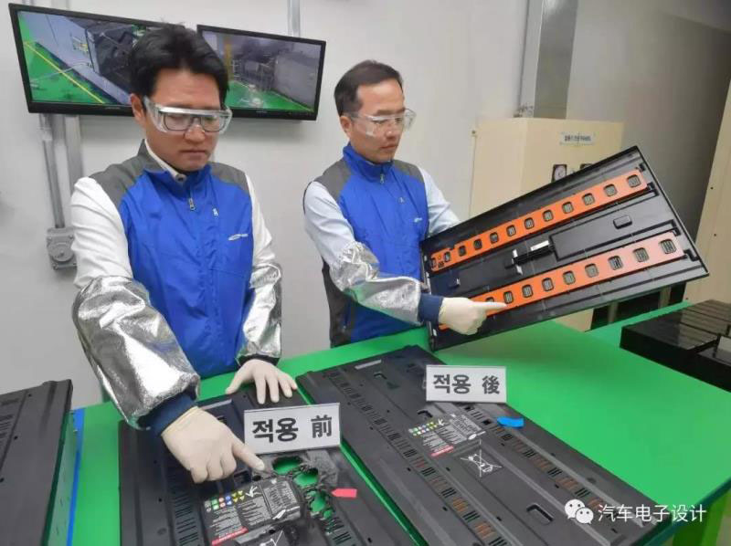 首先是在電池模組的安全隔離方面,三星SDI在新模塊上添加了阻滯劑。含有兩種由特殊化學(xué)物質(zhì)組成的橙色阻滯劑是其特殊滅火系統(tǒng)的一部分,可以阻止電芯受損后起火。