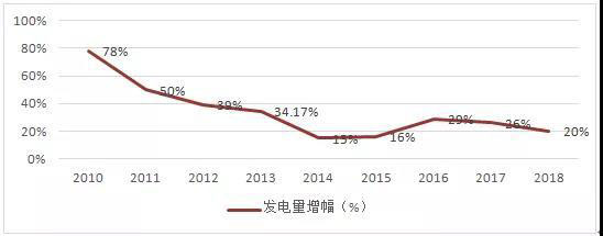 從2010年至2018年,我國風(fēng)能發(fā)電量從497億千瓦時增至3660億千瓦時,平均年增幅為0.83倍。風(fēng)能發(fā)電占比從1.2%增至5.2%,發(fā)電量增幅(比上年增長)則從78%降到了20%,盡管2016年出現(xiàn)了反彈,但整體發(fā)電量增幅呈下降趨勢。2019年上半年,全口徑并網(wǎng)風(fēng)能發(fā)電量為2145億千瓦時,同比增長11.5%,增幅減弱趨勢明顯。