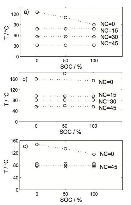 下圖為18650電池在ARC測(cè)試中得到的自加熱溫度曲線,從圖中能夠看到電池的自加熱反應(yīng)主要可以分為三類(lèi):1)第一類(lèi)起始溫度比較低,并且在任何SoC狀態(tài)下都會(huì)反應(yīng),溫度范圍是從32℃-116℃;2)第二類(lèi)反應(yīng)起始溫度較高,可以達(dá)到90-125℃,最高為200-250℃,主要來(lái)自于負(fù)極表面SEI膜破壞,以及裸露出來(lái)的高反應(yīng)活性的新鮮負(fù)極表面與電解液的反應(yīng),特別是在較高的SoC下,負(fù)極中Li含量較高,反應(yīng)活性更強(qiáng),因此反應(yīng)也更劇烈;3)第三類(lèi)反應(yīng)溫度最高,起始溫度可達(dá)200-250℃,這一范圍內(nèi)NCM正極開(kāi)始發(fā)生分解反應(yīng),釋放O2,釋放的O2進(jìn)一步與電解液發(fā)生氧化反應(yīng),這也是導(dǎo)致鋰離子電池?zé)崾Э氐脑?。NCM正極的結(jié)構(gòu)穩(wěn)定性隨著脫Li量的增加而顯著降低,因此我們能夠看到在高SoC下這一反應(yīng)的起始溫度顯著降低。