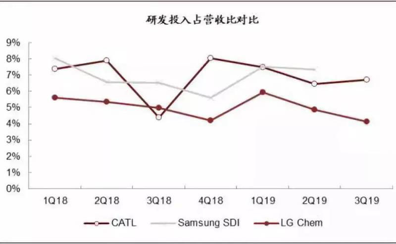 電池業(yè)務(wù)研發(fā)投入占營(yíng)收比重上,CATL高于三星SDI與LG Chem