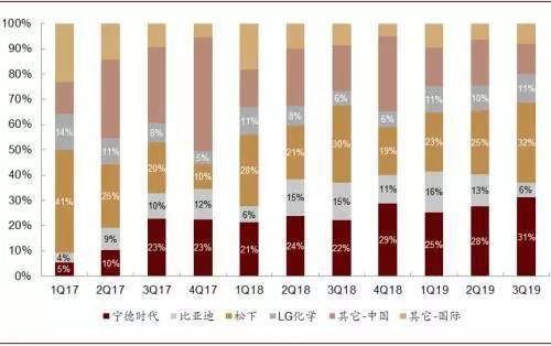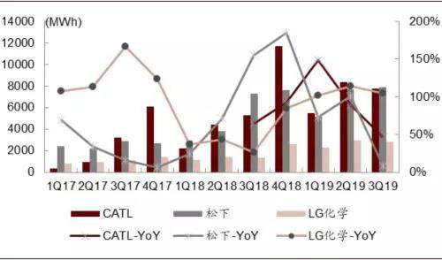 三季度全球動(dòng)力電池裝機(jī)約24.7GWh,松下、CATL、LG Chem、BYD分別占32%、31%、11%、6%,多寡頭格局穩(wěn)固。細(xì)分來(lái)看LG Chem份額提升較快,超越比亞迪,而三星SDI在總量上較低。