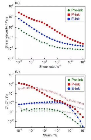 漿料流變特性(a:剪切率vs粘度;b:應(yīng)變vs模量)