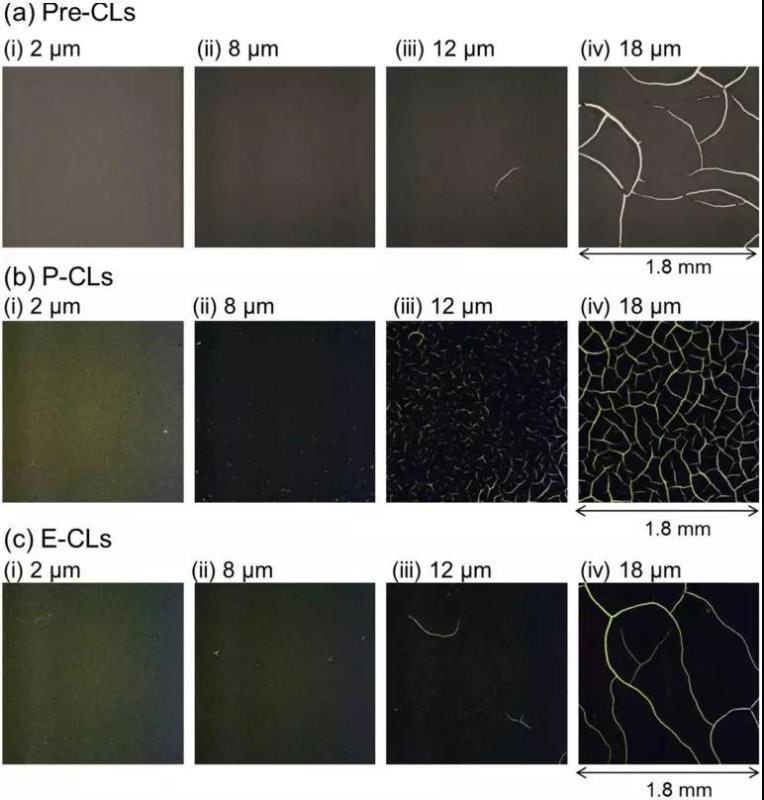 由于涂在PTFE基材上的催化劑層難以處理,無(wú)法進(jìn)行準(zhǔn)確的CCT測(cè)量(即使輕柔操作,PTFE基材也容易彎曲或變形,不可避免地會(huì)影響破裂條件)。為避免這些問(wèn)題,該研究采用在剛性玻璃基板上涂覆的方法進(jìn)行CCT測(cè)量。對(duì)于2 um和8 um厚度Pre-CL催化層,沒(méi)有發(fā)現(xiàn)裂痕現(xiàn)象。12 um厚Pre-CLs催化層產(chǎn)生U形裂痕,該裂痕為primary cracks(裂痕分為PC(primary cracks)、SC(secondary cracks)和DC(cracks caused by critical defects))。18 um厚Pre-CLs催化層產(chǎn)生網(wǎng)格裂痕。
